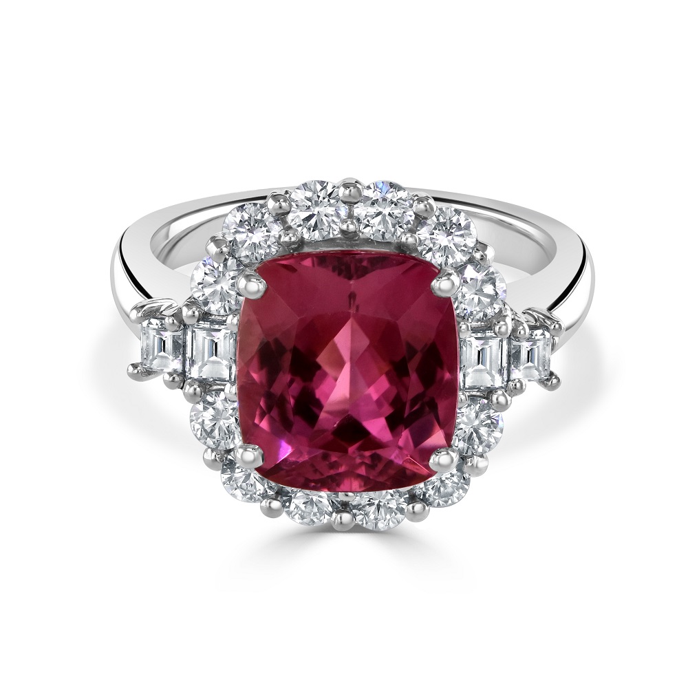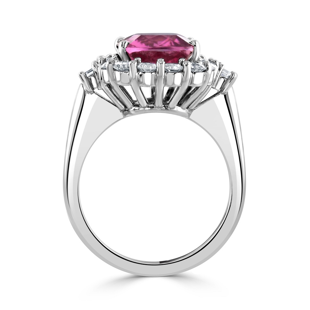 Ideal for those who seek to express their style through unique and luxurious gemstones, this platinum ring with its pink tourmaline and diamond accents is a testament to timeless beauty and exquisite taste. Whether as an engagement ring, a special anniversary gift, or a lavish addition to your jewellery collection, this piece is sure to captivate and enchant, promising a lifetime of admiration and elegance.
