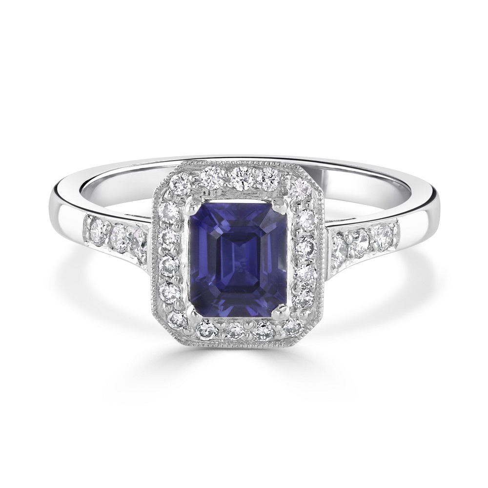 An exquisite platinum sapphire and diamond halo ring. This luxurious ring features a striking centre rectangular sapphire, weighing 0.91ct, its deep blue hues embodying the essence of sophistication and timeless beauty. Encircling this magnificent sapphire is a halo of pavé set diamonds, meticulously arranged to enhance the centrepiece’s luminosity and add an extra layer of sparkle. With a total diamond weight of 0.24ct, these diamonds complement the sapphire's allure, creating a captivating display of brilliance.