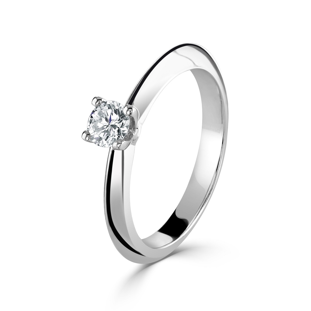An exquisite platinum single stone knife edge ring, a true masterpiece of craftsmanship and elegance. This luxurious ring features a stunning round brilliant cut diamond, meticulously set in a four-claw arrangement to maximize its brilliance and sparkle. The diamond weighs 0.30 carats, striking the perfect balance between subtlety and statement.
