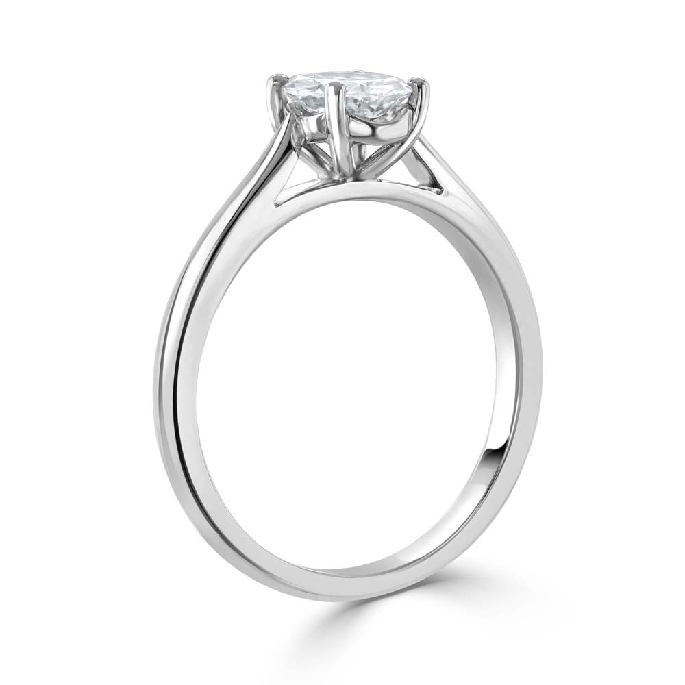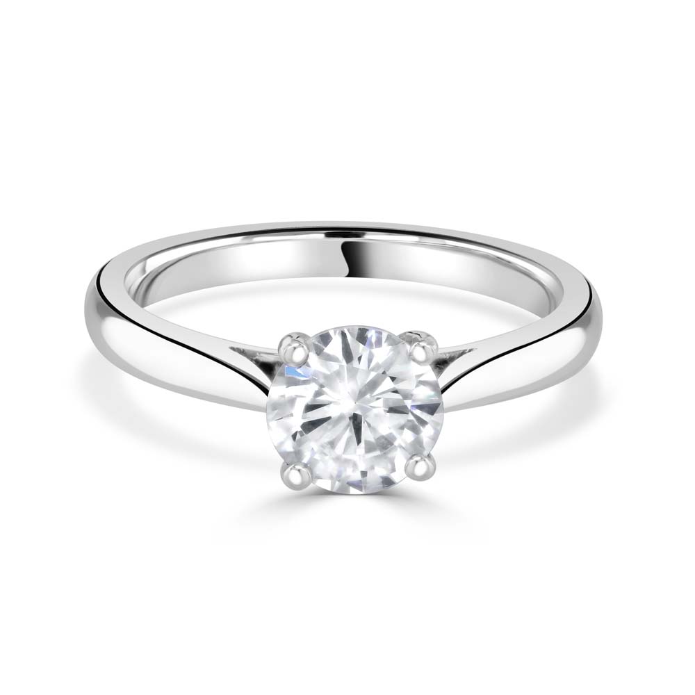A timeless platinum solitaire ring, featuring a resplendent round brilliant cut diamond, weighing a perfect 1.00ct. This exquisite diamond is securely embraced by four scalloped claws, adding a touch of elegance, and ensuring the stone's brilliance is the centrepiece of admiration. The diamond's exceptional quality is affirmed by its GIA certification, boasting an E colour and SI1 clarity, symbolizing both purity and sparkle. The ring's design is complemented by a gracefully tapered shank, which enhances the diamond's visual impact and ensures a comfortable fit. Crafted from premium platinum, known for its strength and durability, this solitaire ring is not just a piece of jewellery but a symbol of timeless beauty and enduring love.