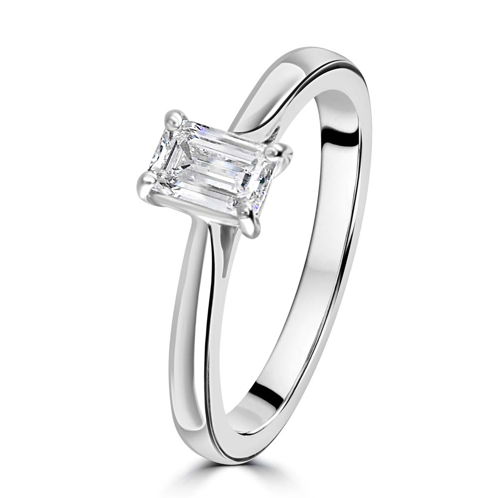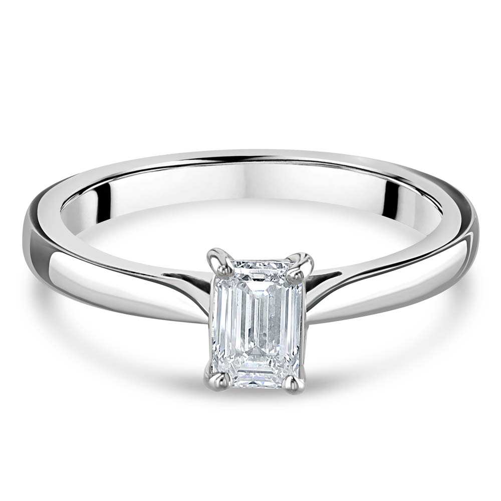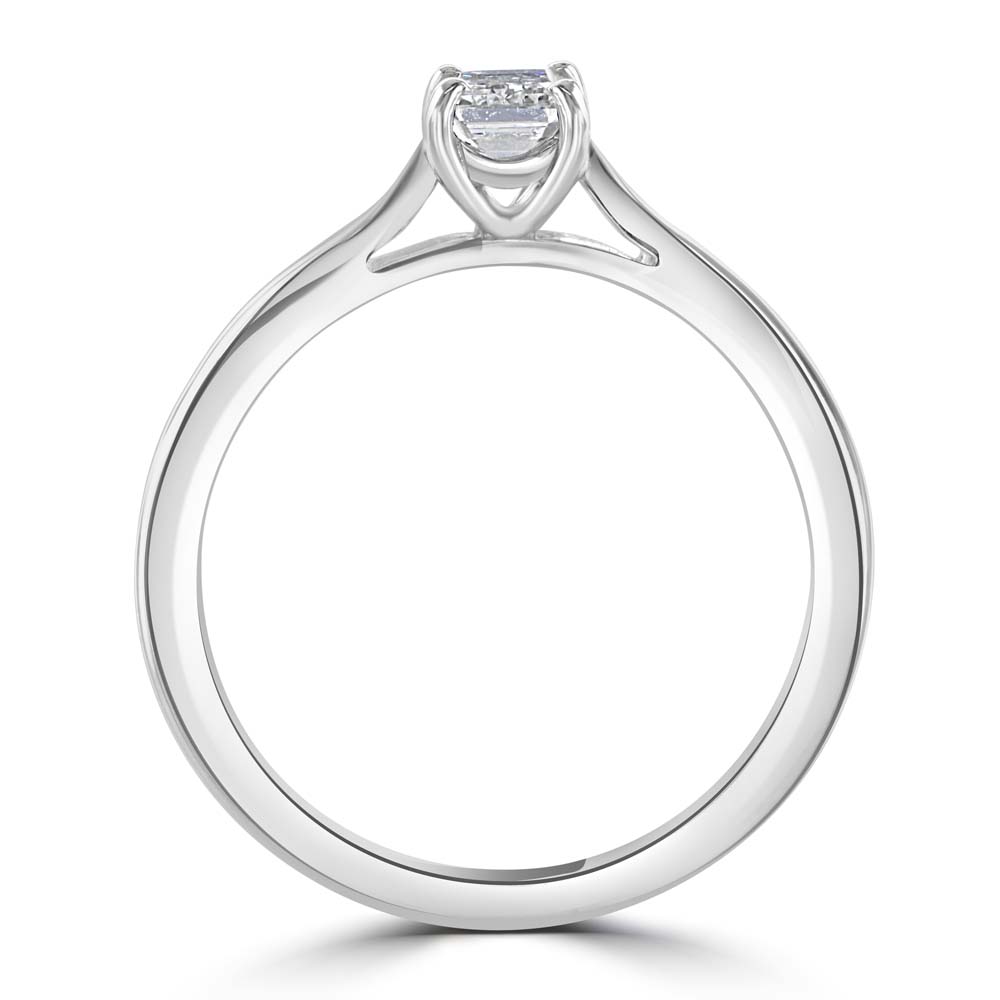 Discover timeless elegance with our platinum solitaire ring, featuring a stunning emerald cut diamond set in a classic 4-claw setting. This exquisite ring is designed with tapered shoulders, adding a touch of sophistication and enhancing the overall brilliance of the centre diamond. The centrepiece of this ring boasts a GIA-certified emerald cut diamond, weighing 0.51 carats. With a superior E colour grade, the diamond offers a pristine, near-colourless appearance that radiates exceptional brilliance. The SI2 clarity grade ensures a beautiful sparkle, with inclusions that are only visible under close inspection. Crafted from premium platinum, this solitaire ring not only exudes luxury but also provides lasting durability. The tapered shoulders of the band elegantly draw attention to the centre diamond, creating a harmonious and balanced look. Perfect for engagements, anniversaries, or any special occasion, this platinum solitaire ring is a symbol of refined elegance and enduring love.
