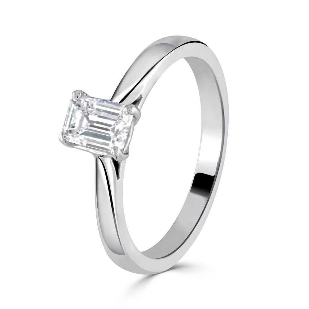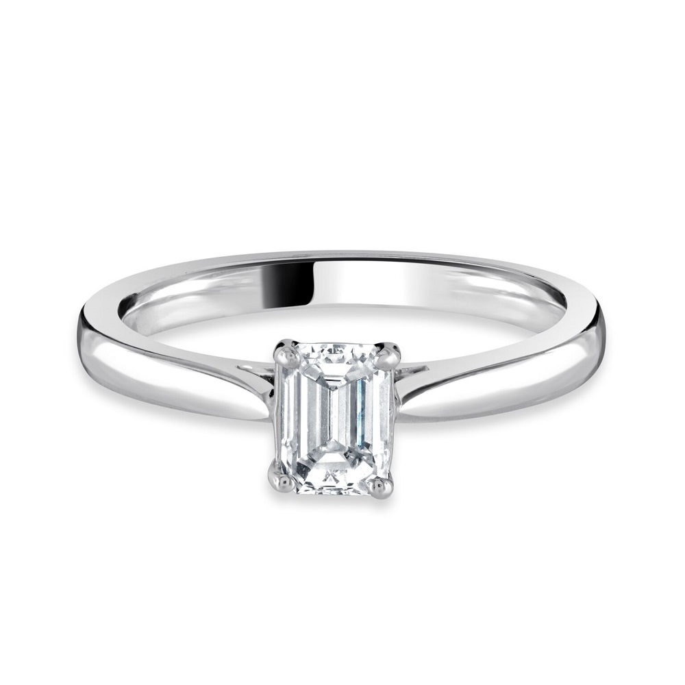Introducing our stunning platinum solitaire ring, featuring a GIA-certified 0.63ct emerald cut diamond, exquisitely set in a four-claw arrangement. This sophisticated design highlights the diamond's exceptional clarity (VS1) and colour (F), ensuring it sparkles with unparalleled brilliance. The tapered shank of the ring enhances the elegant geometry of the emerald cut, creating a sleek and contemporary silhouette. Crafted from high-quality platinum, known for its durability and lustre, this ring is perfect for those who appreciate minimalist elegance with a focus on exceptional gem quality. Ideal for engagements, anniversaries, or as a special gift, this single stone ring is a timeless choice that exemplifies luxury and refined taste.