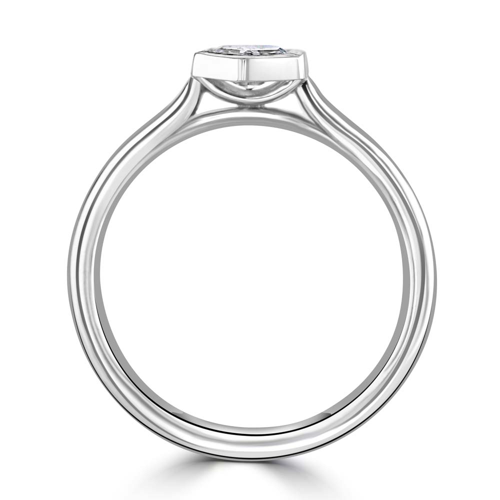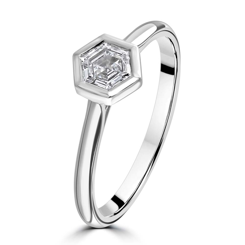 Distinctive and modern, this platinum solitaire ring features a striking hexagon-cut diamond, securely rubover set to showcase its unique geometry and brilliance. The clean lines of the hexagonal shape offer a contemporary twist on classic solitaire styling, while the rubover setting provides a sleek, smooth finish that enhances both comfort and durability. Graded D colour and VS2 clarity, the 0.40ct diamond radiates exceptional purity and sparkle, perfectly complemented by the cool elegance of platinum. A refined statement of individuality and sophistication, this ring is ideal as a modern engagement piece or a standout addition to any fine jewellery collection.