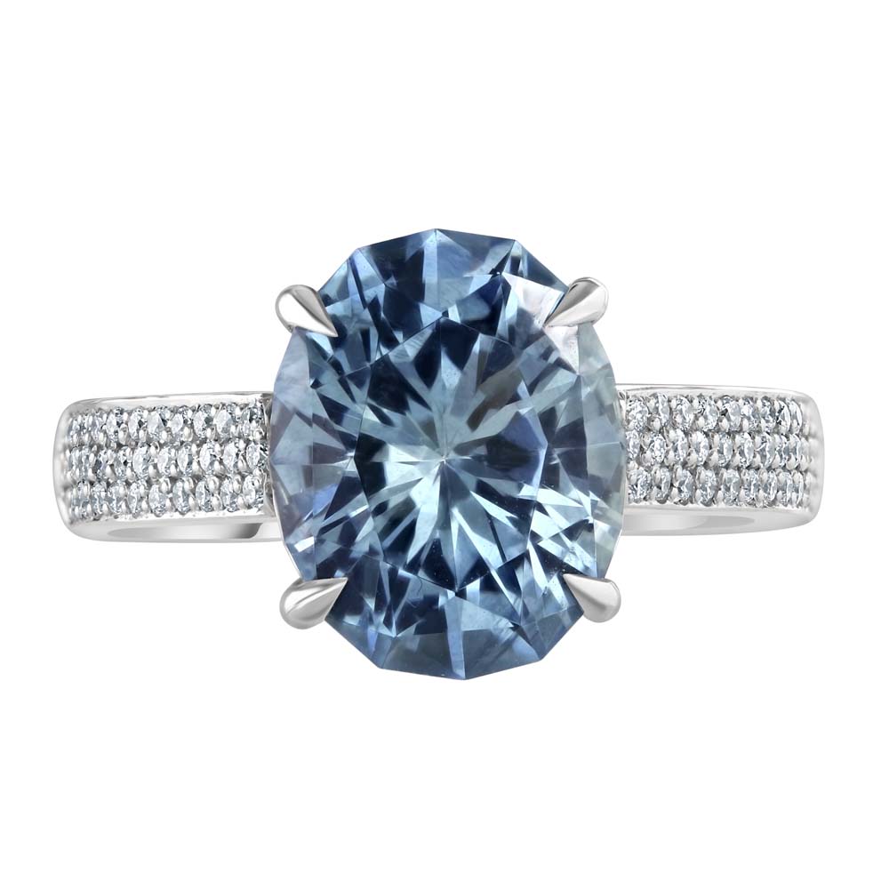 Discover the exquisite beauty of our platinum solitaire ring, featuring a stunning oval cut aquamarine as the centrepiece. This captivating aquamarine, weighing 3.89 carats, is securely set in a classic four-claw setting, showcasing its mesmerizing blue hue and exceptional clarity. Enhancing the ring's elegance, each shoulder is adorned with three rows of pavé set round brilliant cut diamonds, adding a touch of dazzling sparkle. The total diamond weight for the shoulders is 0.26 carats, creating a harmonious blend of brilliance and sophistication. Perfect for marking special occasions or adding a touch of luxury to your jewellery collection, this platinum solitaire ring combines timeless design with exceptional craftsmanship. The durable platinum band beautifully complements the vibrant aquamarine and the radiant diamonds, creating a piece that symbolizes enduring love and elegance. The meticulous pavé setting of the diamonds ensures maximum sparkle and enhances the overall brilliance of the ring. Whether worn alone or paired with other fine jewellery, this solitaire ring is versatile enough for both everyday wear and special occasions, making it a cherished addition to any collection. Crafted with the highest standards of quality, this ring is designed to last a lifetime, retaining its beauty and significance through the years. The combination of the large, eye-catching aquamarine and the delicate diamond accents creates a unique and sophisticated look, perfect for those who appreciate both classic and contemporary styles.