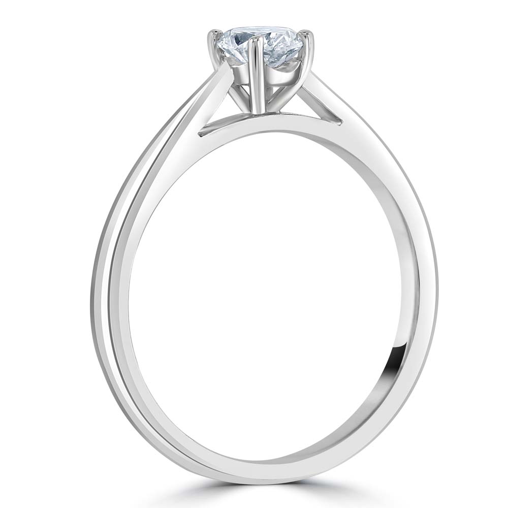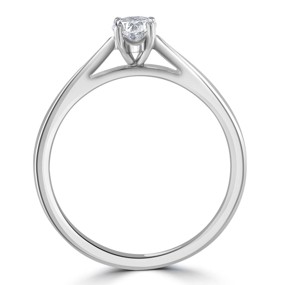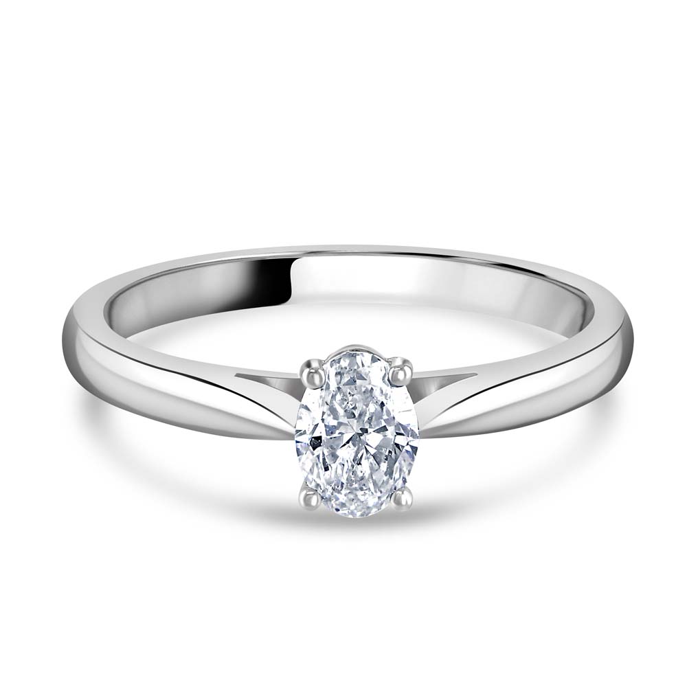 Discover the epitome of elegance with this stunning platinum solitaire ring, featuring a masterfully set brilliant oval cut diamond. The diamond is securely held in place by four under-wire claws, ensuring both its safety and prominence. The ring's design gracefully tapers towards the shank, highlighting the sleek and sophisticated silhouette of the platinum band. This exquisite piece of jewellery is crafted for those who seek a blend of classic style and modern refinement. This solitaire ring is a timeless treasure that symbolizes enduring love and commitment.
