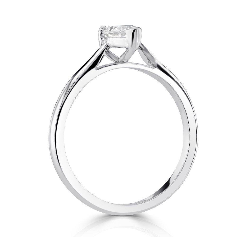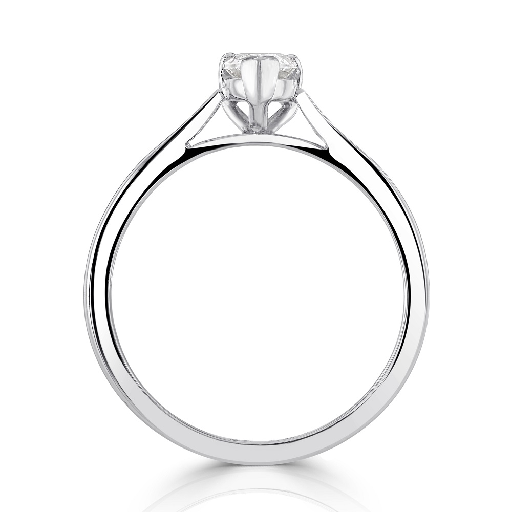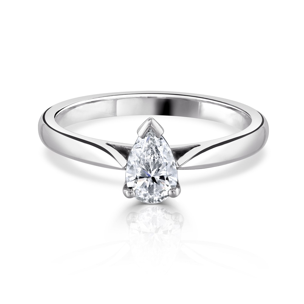 Our elegant platinum solitaire ring, showcasing a stunning pear cut diamond. This exquisite diamond, weighing 0.50 carats and certified with an E colour and SI1 clarity, is securely held in a unique three-claw setting that accentuates its sleek, elongated shape and brilliant sparkle. The ring's band is skilfully tapered, enhancing the overall sleek design and focusing attention on the luminous centrepiece. Crafted from high-quality platinum, this ring offers a durable and timeless look, making it perfect for engagements, special celebrations, or as an extraordinary gift. Embrace this symbol of luxury and timeless beauty, designed to be a cherished addition to any fine jewellery collection.