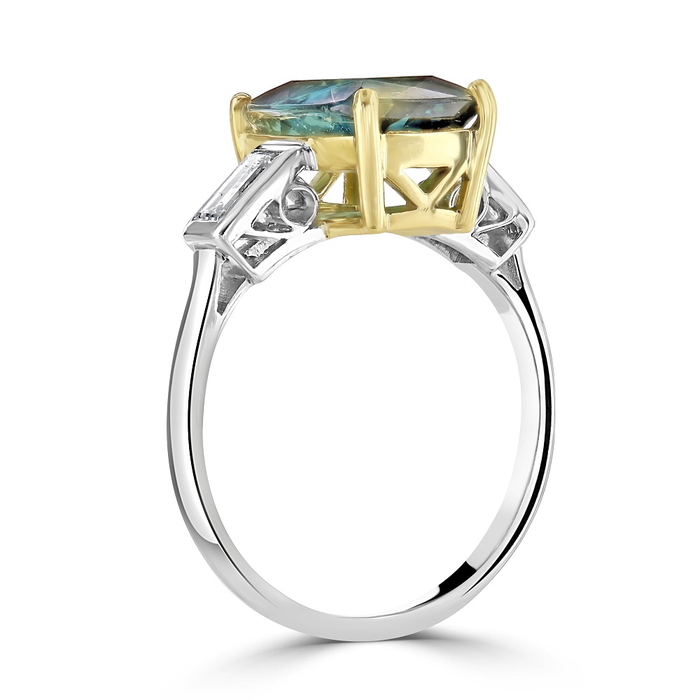 Discover the striking beauty of our platinum and 18ct yellow gold trilogy ring, a magnificent piece that marries vibrant colour with classic design. At the heart of this exquisite ring is a 3.42ct cushion cut teal tourmaline, securely held by four claws, showcasing its deep, captivating hue. Flanking this stunning gemstone are two rubover set baguette cut diamonds, contributing an additional 0.40 carats of sparkle. The unique combination of the rich teal tourmaline and the clarity of the diamonds makes this ring a standout piece. Crafted with a blend of platinum and 18ct yellow gold, this ring offers a luxurious, two-tone aesthetic that enhances the overall elegance of the design. Perfect for special occasions, engagements, or as an opulent gift, this trilogy ring is a timeless investment for those who appreciate exquisite craftsmanship and unique gemstone jewellery.