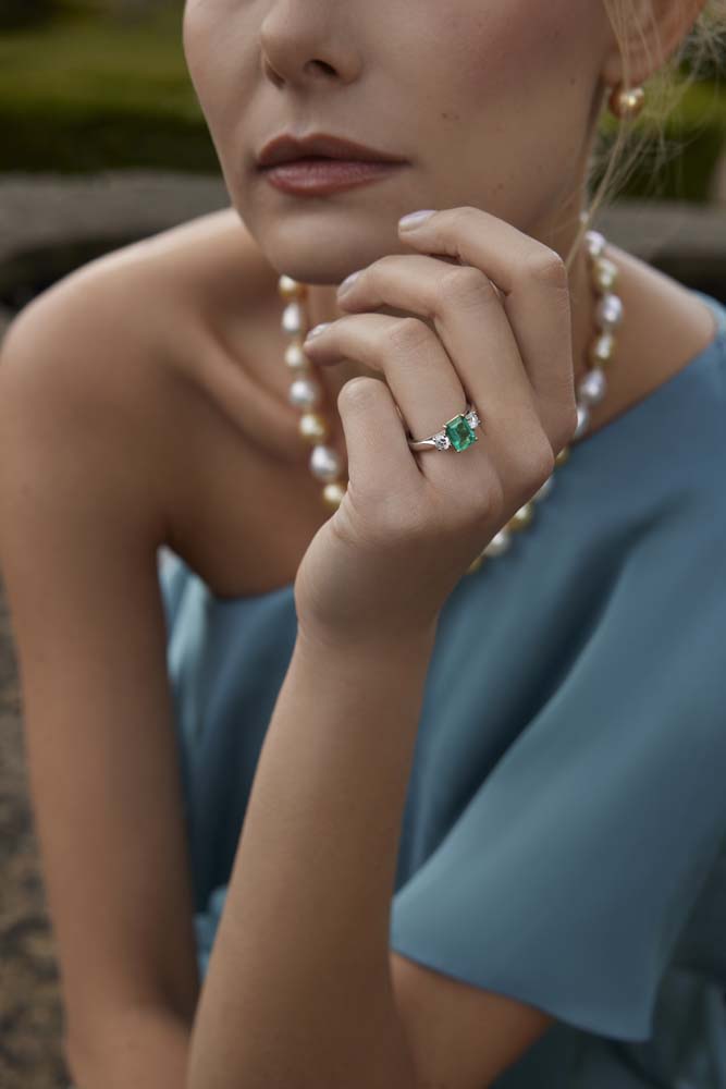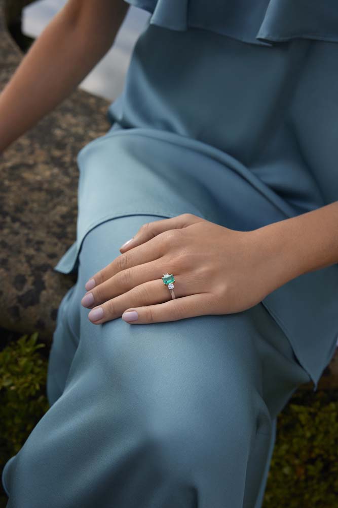 Flanking the central emerald are two round brilliant cut diamonds, each claw set to capture and reflect light from every angle, adding a dazzling brilliance to the piece. The diamonds have a combined total weight of 0.44ct, perfectly balancing the rich colour of the emerald with their luminous sparkle.