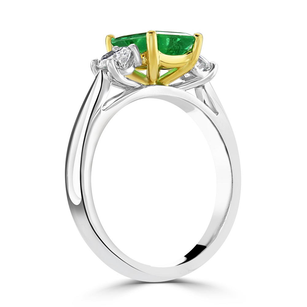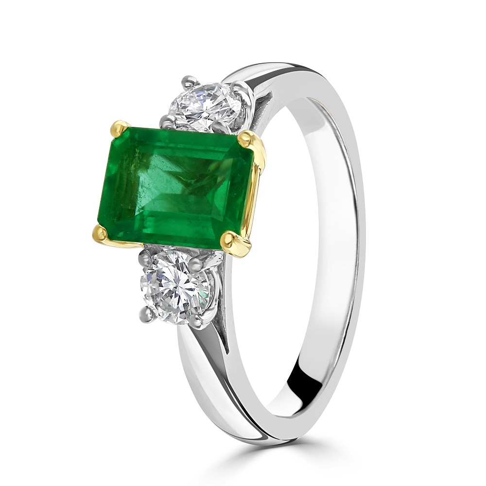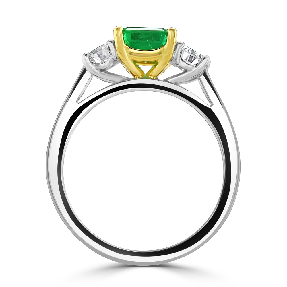 An elegant platinum and 18ct yellow gold trilogy ring, a magnificent piece that embodies timeless sophistication. This exquisite ring features a breathtaking emerald cut emerald at its heart, claw set to perfection, and weighing an impressive 1.19ct. The emerald's vibrant green hues are beautifully complemented by the luxurious platinum and 18ct yellow gold setting, creating a stunning contrast that is both striking and elegant.