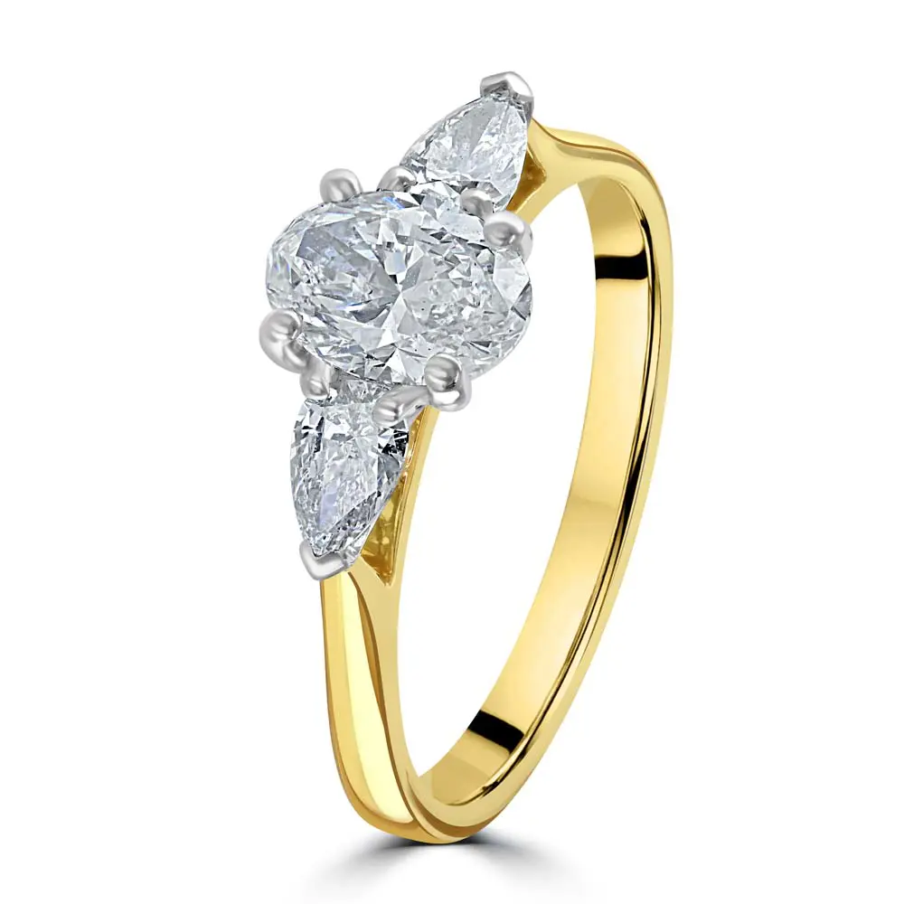 A stunning fusion of classic design and contemporary elegance, this trilogy ring is meticulously crafted in platinum and 18ct yellow gold, offering a rich contrast that enhances its timeless appeal. At the centre lies a luminous 0.80ct oval cut diamond, graded E for colour and VS2 for clarity, and certified by GIA ensuring exceptional quality and brilliance. Framing the centrepiece are two pear cut diamonds with a combined weight of 0.36ct, each claw-set in a graceful three-claw arrangement. With their G colour and VS clarity, these side stones add a soft, romantic silhouette that perfectly complements the central diamond’s sparkle. Symbolising a journey of love—past, present, and future—this ring is a refined choice for engagements, anniversaries, or personal milestones. A true testament to craftsmanship and sentiment, designed to be treasured for generations.