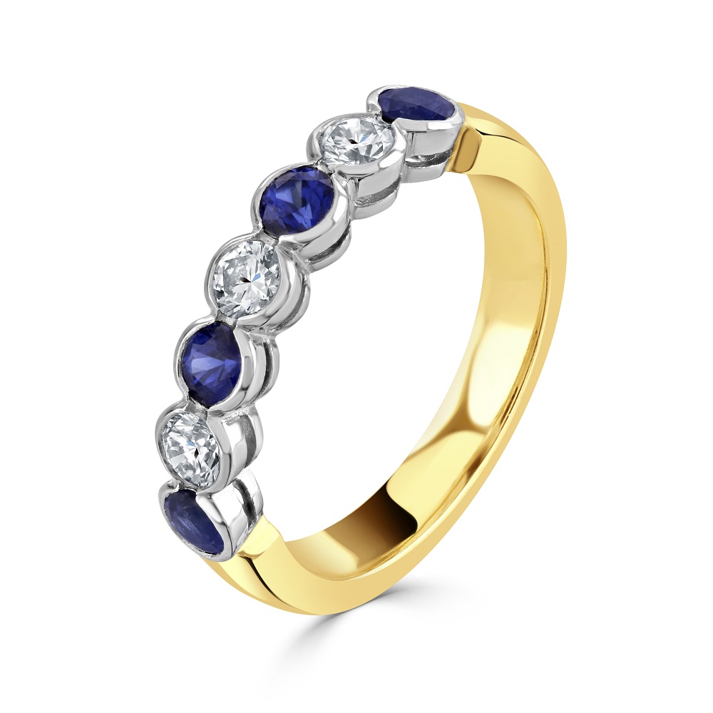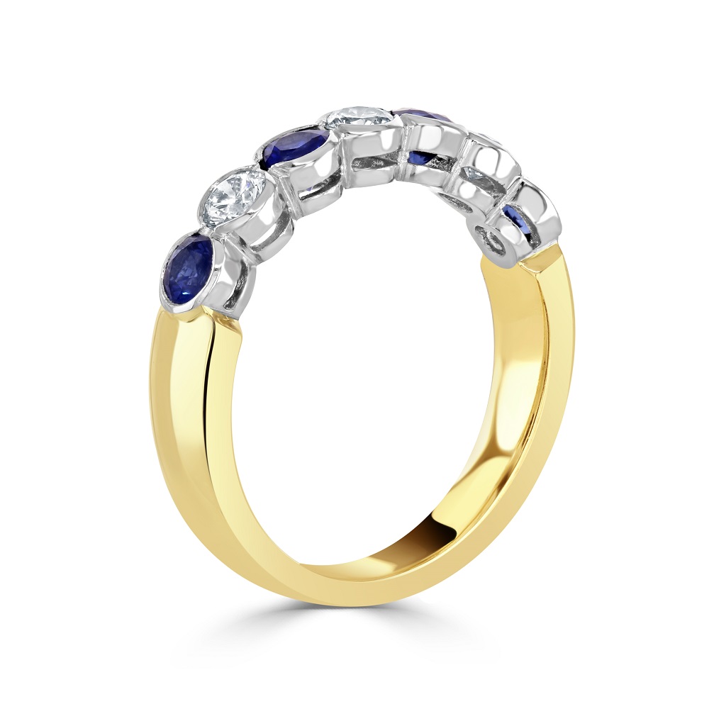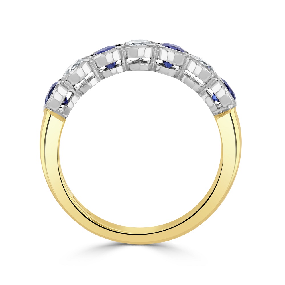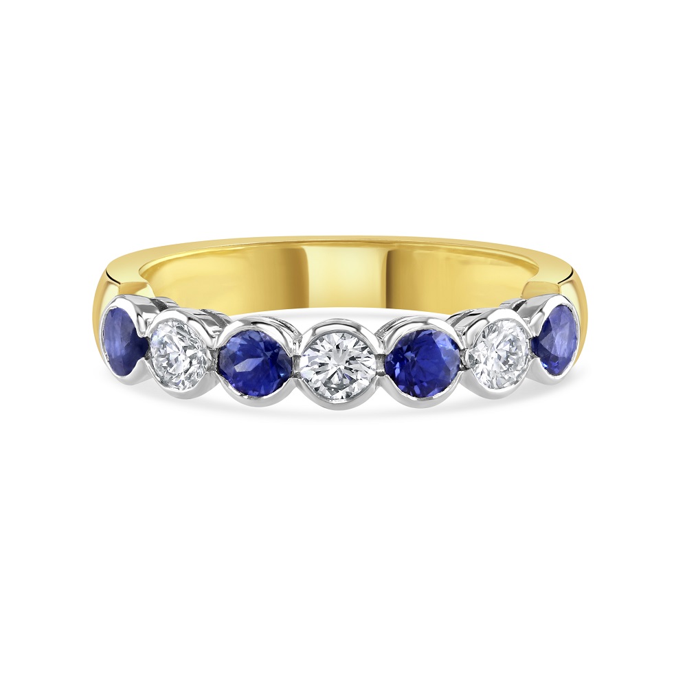An exquisite blend of classic and contemporary in our 18ct yellow gold seven gemstone ring, featuring a sophisticated platinum head. This stunning piece is rubover set with an alternating pattern of four round sapphires and three round brilliant cut diamonds, creating a balanced and eye-catching design. The sapphires, totalling 0.80 carats, offer a captivating deep blue hue, while the diamonds provide 0.37 carats of radiant sparkle, enhancing the overall aesthetic appeal.
