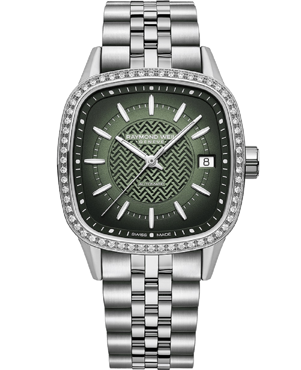 The next evolution of the freelancer automatic collection is a new interpretation of the form watch, that elegantly transcends convention. This model has been reimagined for the modern individual, fusing a cushion-shaped design with signature brand details that radiate contemporary sophistication. Measuring a 34.5 x 34.5 mm diameter, the freelancer ladies automatic has a square, cushion-shaped housing and features an automatic Swiss-made movement, with a 38 hours power reserve, ideally suited to daily wear. This model features luminescent hour and minute hands with matching indexes, a fine centre seconds hand and a date indication at 3 o’clock. The dial’s gradient green draws the eye towards the center, where a captivating W-shaped motif, as a nod to the RAYMOND WEIL brand, creates subtle shades that mesmerize the wearer Perfect balance of tradition and modernity, the freelancer automatic collection showcases RAYMOND WEIL’s unwavering dedication to craftsmanship and artistic expression.