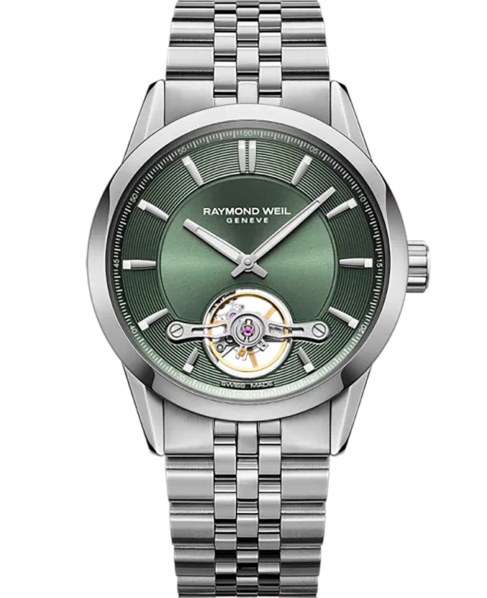 Stainless steel Raymond Weil Freelancer mens watch with a green baton dial on a steel bracelet with folding clasp Model: 2781-ST-52051