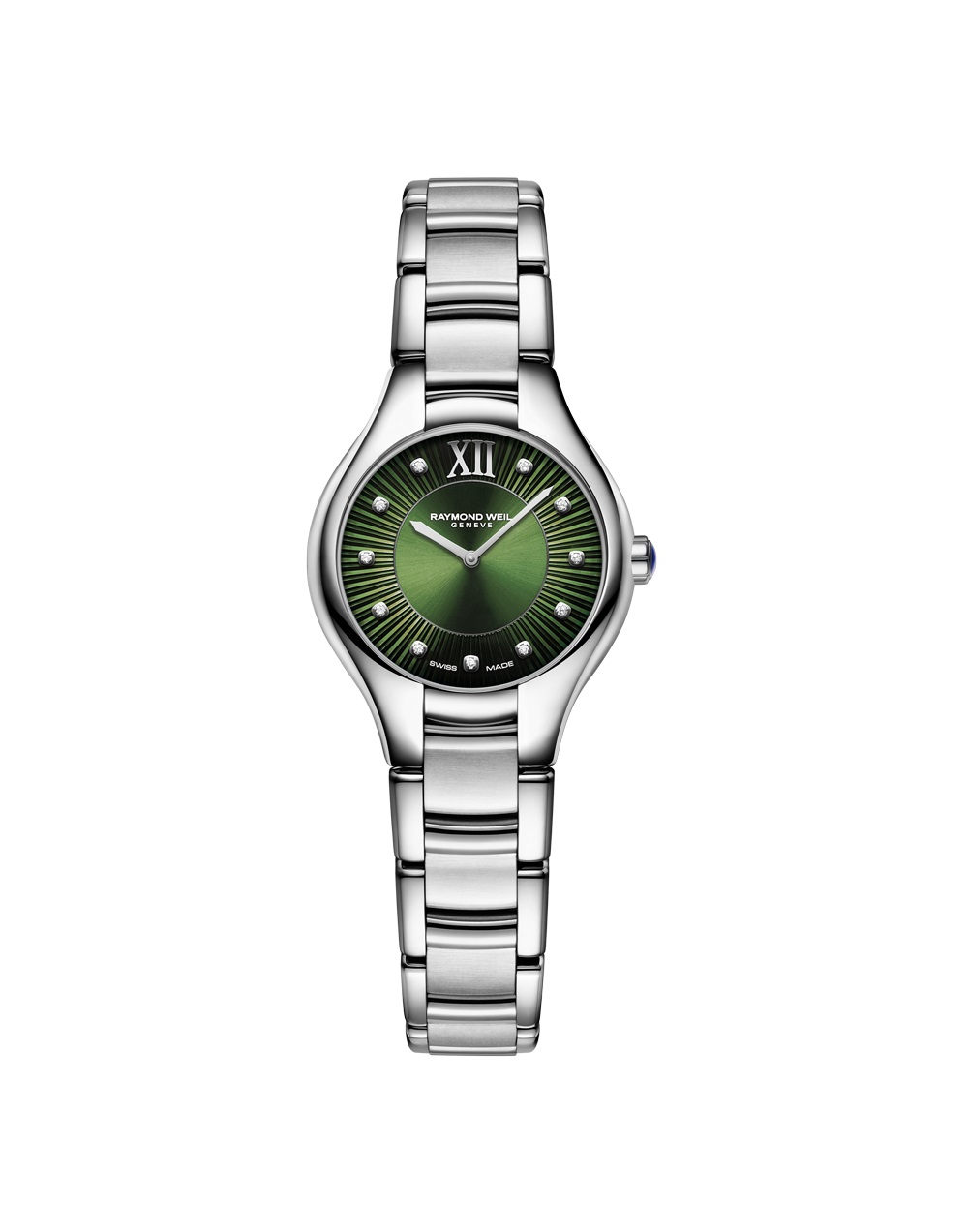 The noemia 5124-ST-60181 model features a green roman numeral dial, decorated with diamond dot indexes that add wow factor to the timepiece. The round, hand polished 24mm polished stainless steel case houses a quartz movement – the most precise watch keeping movement ever created. This timepiece combines elegance, style, an abundance of class and demonstrates RAYMOND WEIL’s passion for family. The noemia collection has been designed to convey precision timekeeping whilst adopting a very contemporary design, maximized through the use of diamond embellishments on the colourful galvanic dials.