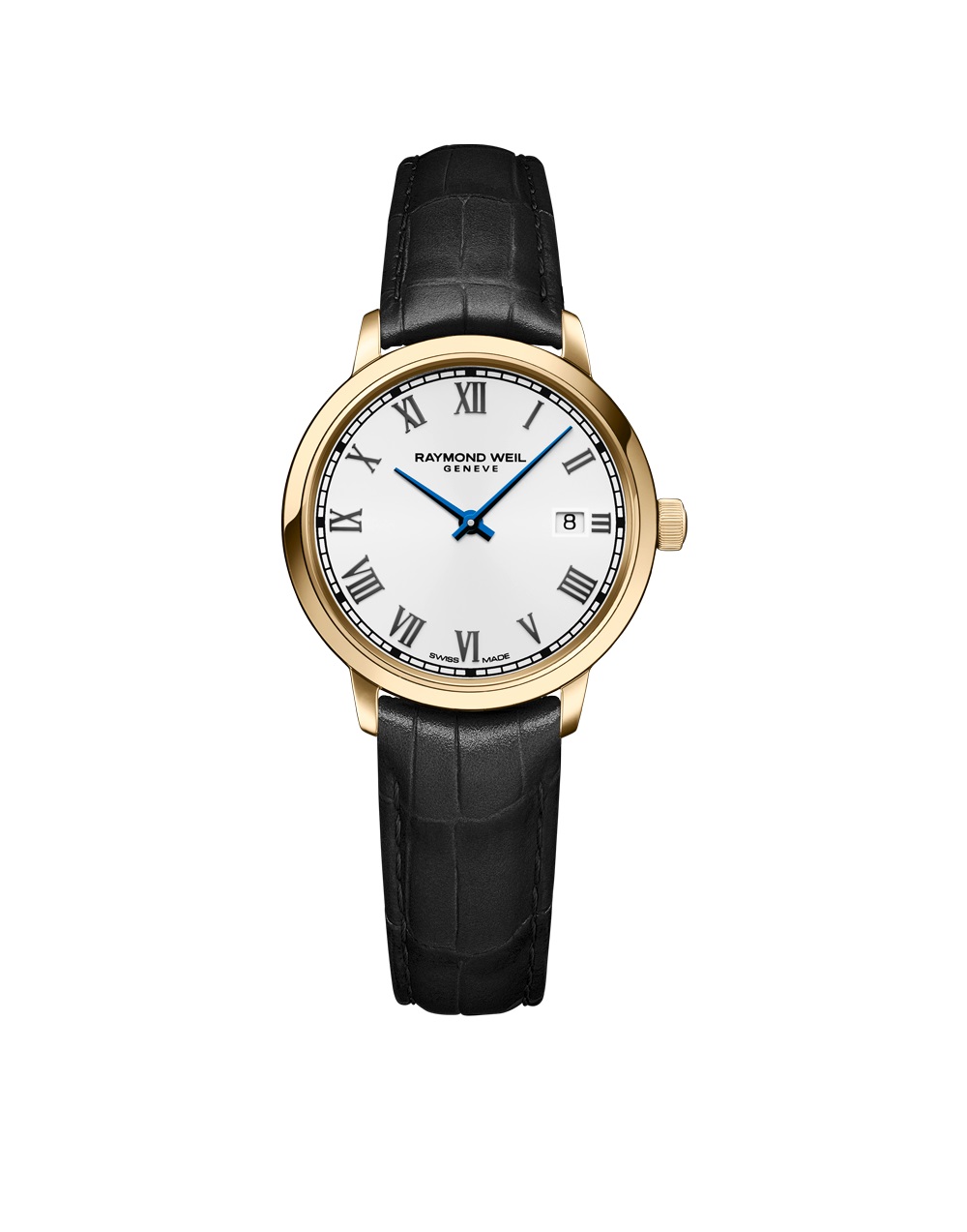 Equipped with a quartz movement, this toccata ladies’ watch features a stainless steel 29 mm case with yellow gold PVD plating and a date window at 3 o’clock. The white lacquered dial is set with applied Roman numeral indexes and has a railway-track chapter ring that aids readability. To complement this modern classic, alligator motifs have been added on the strap. Refined design and timeless materials: the toccata collection celebrates the artistic and musical spirit behind the Brand’s DNA. Following in the footsteps of the great composers, toccata timepieces promote the Swiss horology of RAYMOND WEIL while respecting the tradition and heritage handed down from generation to generation within the family company.