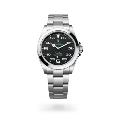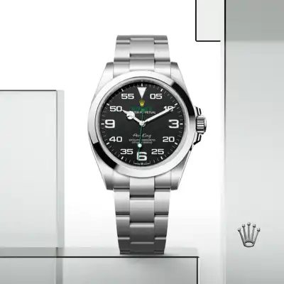 The Air-King dial features a distinctive black dial with a combination of large 3, 6 and 9 numerals marking the hours and a prominent minute scale for navigational time readings. It bears the name Air-King in the same lettering that was designed specially for the model in the 1950s.