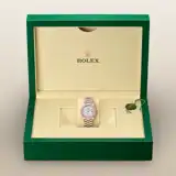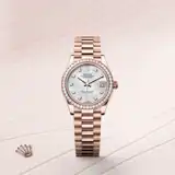 This dial features diamonds in 18 ct gold settings. Mother-of-pearl is by its nature full of mystery and surprises. Depending on its origin, it can be pink, white, black or yellow. It differs in colour, intensity and structure according to the part of the shell from which it is extracted. At Rolex, mother-of-pearl is never artificially coloured. Instead, particular know-how and skill are devoted to simply highlighting its natural beauty and preserving the original hues. As all mother-of-pearl dials are unique pieces, an identical dial will never be found on another wrist.