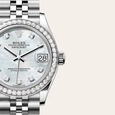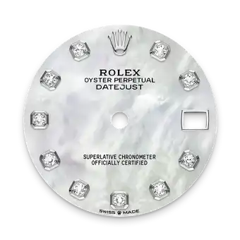 This dial features diamonds in 18 ct gold settings. Mother-of-pearl is by its nature full of mystery and surprises. Depending on its origin, it can be pink, white, black or yellow. It differs in colour, intensity and structure according to the part of the shell from which it is extracted. At Rolex, mother-of-pearl is never artificially coloured. Instead, particular know-how and skill are devoted to simply highlighting its natural beauty and preserving the original hues. As all mother-of-pearl dials are unique pieces, an identical dial will never be found on another wrist.