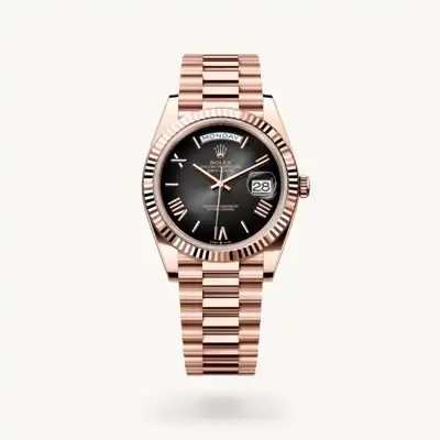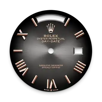 The version presented, in 18 ct Everose gold, introduces slate ombré dial – a completely new hue for such a dial, whose surface, coloured at the centre, progresses to a deep black around the edge. Also appearing for the first time on the ombré dial of this watch are faceted, deconstructed Roman numerals and faceted index hour markers in 18 ct pink gold. Until now, Rolex ombré dials were set with diamond hour markers and were reserved for the Day-Date 36. This dial represents the continuity of a design that Rolex introduced in the 1980s and relaunched in 2019. The manufacture of these dials with a concentric gradient involves the application of black lacquer, a delicate operation overseen by a specialist whose task it is to ensure the harmonious transition from colour to darkness.