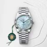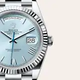 The ice-blue dial is the discreet and exclusive signature of a Rolex platinum watch. Rolex uses platinum, the noblest of metals, for the finest of watches. This exclusive dial colour can be found only on the Day-Date, the Cosmograph Daytona, the Perpetual 1908 and the Land-Dweller.
