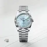 The Rolex fluted bezel is a mark of distinction. Originally, the fluting of the Oyster bezel had a functional purpose: it served to screw the bezel onto the case helping to ensure the waterproofness of the watch. It was therefore identical to the fluting on the case back, which was also screwed onto the case for waterproofness, using specific Rolex tools. Over time, the fluting became an aesthetic element, a genuine Rolex signature feature. Today the fluted bezel is a mark of distinction, in platinum on this Day-Date 40.