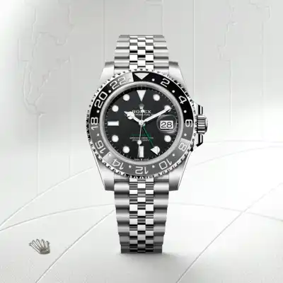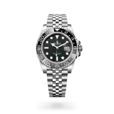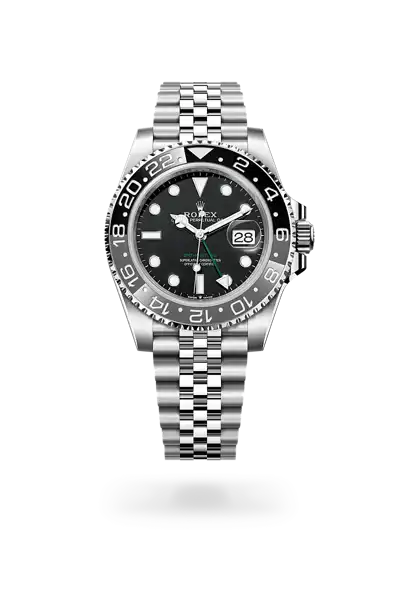 This model features a black dial and a two-colour Cerachrom bezel insert in grey and black ceramic. In addition to conventional hour, minute and seconds hands, the GMT-Master II features an arrow-tipped hand, which circles the dial once every 24 hours, as well as a bidirectional rotatable 24-hour graduated bezel. The distinctively coloured 24-hour hand displays the “home” reference time in a first time zone which can be read on the graduations on the bezel. The traveller’s local time is easily set by “jumping” from hour to hour, thanks to an ingenious mechanism operated via the winding crown: the hour hand can be adjusted forwards or backwards independently of the minute and seconds hands. This allows travellers to adapt to their new time zone without affecting the precision of their timekeeping.