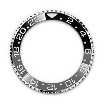 Bidirectional rotatable 24-hour graduated bezel. Two-colour grey and black Cerachrom insert in ceramic, moulded numerals and graduations