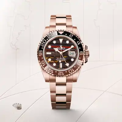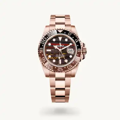 This model features a tiger iron dial and a two-colour Cerachrom bezel insert in brown and black ceramic. In addition to conventional hour, minute and seconds hands, the GMT-Master II features an arrow-tipped hand, which circles the dial once every 24 hours, as well as a bidirectional rotatable 24-hour graduated bezel. The distinctively coloured 24-hour hand displays the “home” reference time in a first time zone which can be read on the graduations on the bezel. The traveller’s local time is easily set by “jumping” from hour to hour, thanks to an ingenious mechanism operated via the winding crown: the hour hand can be adjusted forwards or backwards independently of the minute and seconds hands. This allows travellers to adapt to their new time zone without affecting the precision of their timekeeping.