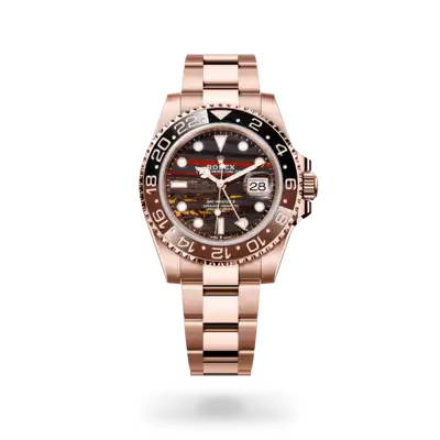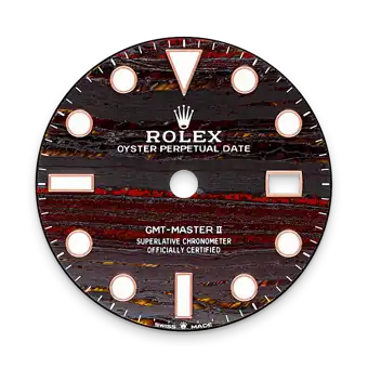 This GMT-Master II features a dial in tiger iron. This metamorphic rock, used by Rolex for the first time on this watch, is characterized by its complex structure. Composed of three minerals – tiger’s eye, red jasper and silvery hematite – it is a stone that pulses with golden and orangey tints, which, following painstaking selection and meticulous assembly, marry harmoniously with the colours of the case and bracelet.