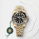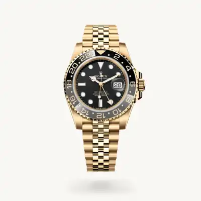 This model features a black dial and a two-colour Cerachrom bezel insert in grey and black ceramic. In addition to conventional hour, minute and seconds hands, the GMT-Master II features an arrow-tipped hand, which circles the dial once every 24 hours, as well as a bidirectional rotatable 24-hour graduated bezel. The distinctively coloured 24-hour hand displays the “home” reference time in a first time zone which can be read on the graduations on the bezel. The traveller’s local time is easily set by “jumping” from hour to hour, thanks to an ingenious mechanism operated via the winding crown: the hour hand can be adjusted forwards or backwards independently of the minute and seconds hands. This allows travellers to adapt to their new time zone without affecting the precision of their timekeeping.