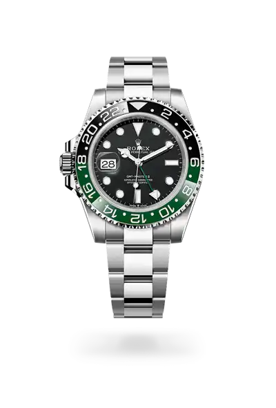 This model features a black dial and a two-colour Cerachrom bezel insert in green and black ceramic. In addition to conventional hour, minute and seconds hands, the GMT-Master II features an arrow-tipped hand, which circles the dial once every 24 hours, as well as a bidirectional rotatable 24-hour graduated bezel. The distinctively coloured 24-hour hand displays the “home” reference time in a first time zone which can be read on the graduations on the bezel. The traveller’s local time is easily set by “jumping” from hour to hour, thanks to an ingenious mechanism operated via the winding crown: the hour hand can be adjusted forwards or backwards independently of the minute and seconds hands. This allows travellers to adapt to their new time zone without affecting the precision of their timekeeping. The Cerachrom bezel insert features an original colour combination: black and an exclusive green that is reserved for this model.