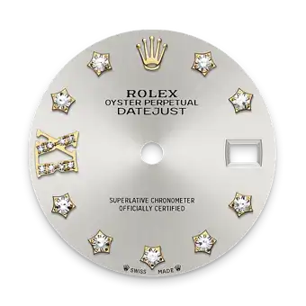 This dial features diamonds in 18 ct gold settings and a Roman IX in 18 ct gold, set with 8 diamonds. The sunray finish creates delicate light reflections on many dials in the Oyster Perpetual collection. It is obtained using masterful brushing techniques that create grooves running outwards from the centre of the dial. Light is diffused consistently along each engraving, creating a characteristic subtle glow that moves depending on the position of the wrist. Once the sunray finish has been completed, the dial colour is applied using Physical Vapour Deposition or electroplating. A light coat of varnish gives the dial its final look.