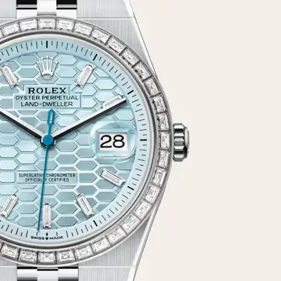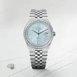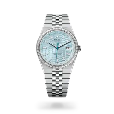 Rare and precious, platinum is striking for its silvery whiteness and vibrant luminosity. It is among the densest and heaviest metals in the world, distinguished by unique chemical and physical properties such as exceptional corrosion resistance. Paradoxically, it is also soft, elastic and highly malleable, which makes machining and polishing especially difficult, demanding an extremely high degree of skill. Rolex always uses 950 platinum, an alloy consisting of 950‰ (thousandths) platinum, painstakingly crafted in-house by the fine metalworkers at Rolex. The noblest of metals for the finest of watches.
