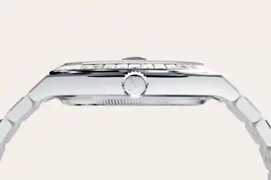 This ice blue – a colour reserved for watches made of platinum – dial is adorned with a honeycomb motif with a sunray finish. Its creation calls on traditional craftsmanship and high-technology methods, all mastered in-house. The honeycomb structure is cut with a femtosecond laser, which is also used to etch the delicate lines in the grooves separating each cell. The dial is set with 10 baguette-cut diamonds to mark the hours.
