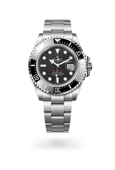 The black dial of the Sea-Dweller has the large hands and indices reserved for Rolex professional models. The dial bears the name Sea-Dweller in red, a reference to the first model. The innovative Chromalight display on the dial pushes back the boundaries of visibility in dark environments. Its distinctive blue glow lasts up to eight hours with a uniform luminosity, practically twice as long as that of standard luminescent materials.
