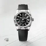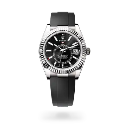 The Sky-Dweller’s new Oysterflex bracelet, developed by Rolex and patented, offers a sporty alternative to metal bracelets. The bracelet attaches to the watch case and the Oysterclasp by a flexible titanium and nickel alloy metal blade. The blade is overmoulded with high-performance black elastomer which is particularly resistant to environmental effects, very durable and perfectly inert for the wearer of the watch. For enhanced comfort, the inside of the Oysterflex bracelet is equipped with a patented longitudinal cushion system that stabilizes the watch on the wrist and fitted with an 18 ct white gold Oysterclasp. It also features the Rolex Glidelock extension system, designed by the brand and patented. This inventive toothed mechanism, integrated beneath the clasp, allows fine adjustment of the bracelet length by some 15 mm in increments of approximately 2.5 mm, without the use of tools.