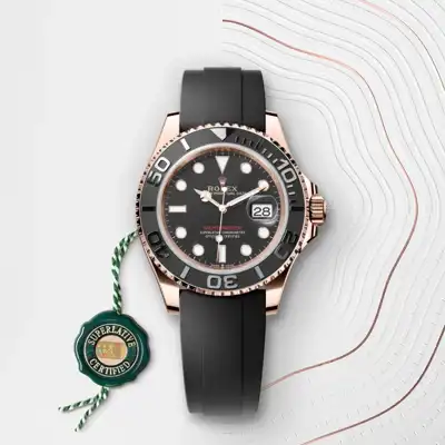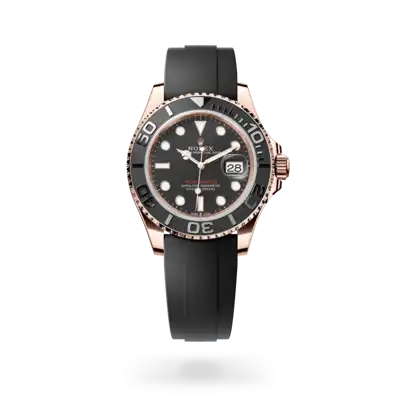 The Yacht-Master’s new Oysterflex bracelet, developed by Rolex and patented, offers a sporty alternative to metal bracelets. The bracelet attaches to the watch case and the Oysterlock safety clasp by a flexible titanium and nickel alloy metal blade. The blade is overmoulded with high-performance black elastomer which is particularly resistant to environmental effects, very durable and perfectly inert for the wearer of the watch. For enhanced comfort, the inside of the Oysterflex bracelet is equipped with a patented longitudinal cushion system that stabilizes the watch on the wrist and fitted with an 18 ct Everose gold Oysterlock safety clasp. It also features the Rolex Glidelock extension system, designed by the brand and patented. This inventive toothed mechanism, integrated beneath the clasp, allows fine adjustment of the bracelet length by some 15 mm in increments of approximately 2.5 mm, without the use of tools.