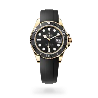 The Yacht-Master’s new Oysterflex bracelet, developed by Rolex and patented, offers a sporty alternative to metal bracelets. The bracelet attaches to the watch case and the Oysterlock safety clasp by a flexible titanium and nickel alloy metal blade. The blade is overmoulded with high-performance black elastomer which is particularly resistant to environmental effects, very durable and perfectly inert for the wearer of the watch. For enhanced comfort, the inside of the Oysterflex bracelet is equipped with a patented longitudinal cushion system that stabilizes the watch on the wrist and fitted with an 18 ct yellow gold Oysterlock safety clasp. It also features the Rolex Glidelock extension system, designed by the brand and patented. This inventive toothed mechanism, integrated beneath the clasp, allows fine adjustment of the bracelet length by some 15 mm in increments of approximately 2.5 mm, without the use of tools.