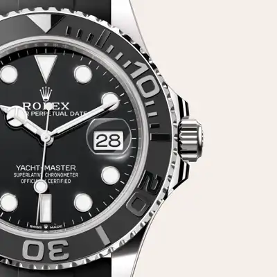 The Yacht-Master’s new Oysterflex bracelet, developed by Rolex and patented, offers a sporty alternative to metal bracelets. The bracelet attaches to the watch case and the Oysterlock safety clasp by a flexible titanium and nickel alloy metal blade. The blade is overmoulded with high-performance black elastomer which is particularly resistant to environmental effects, very durable and perfectly inert for the wearer of the watch. For enhanced comfort, the inside of the Oysterflex bracelet is equipped with a patented longitudinal cushion system that stabilizes the watch on the wrist and fitted with an 18 ct white gold Oysterlock safety clasp. It also features the Rolex Glidelock extension system, designed by the brand and patented. This inventive toothed mechanism, integrated beneath the clasp, allows fine adjustment of the bracelet length by some 15 mm in increments of approximately 2.5 mm, without the use of tools.