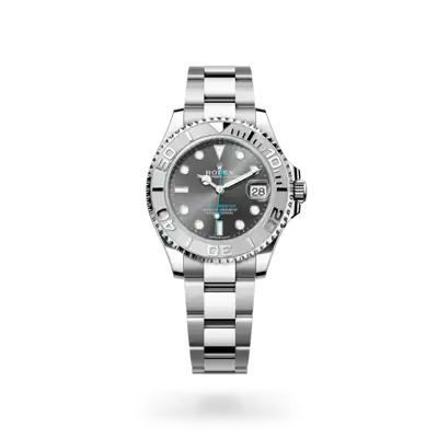 Many Rolex watches are available with the now-legendary combination of yellow, white or Everose gold and steel known as Rolesor, but Rolesium is a creation specific to the Yacht-Master. While the case and bracelet are in rugged Oystersteel, the bezel of the Rolesium versions is made of platinum, imparting a silvery whiteness and vibrant luminosity for an unmistakable sense of luxury.