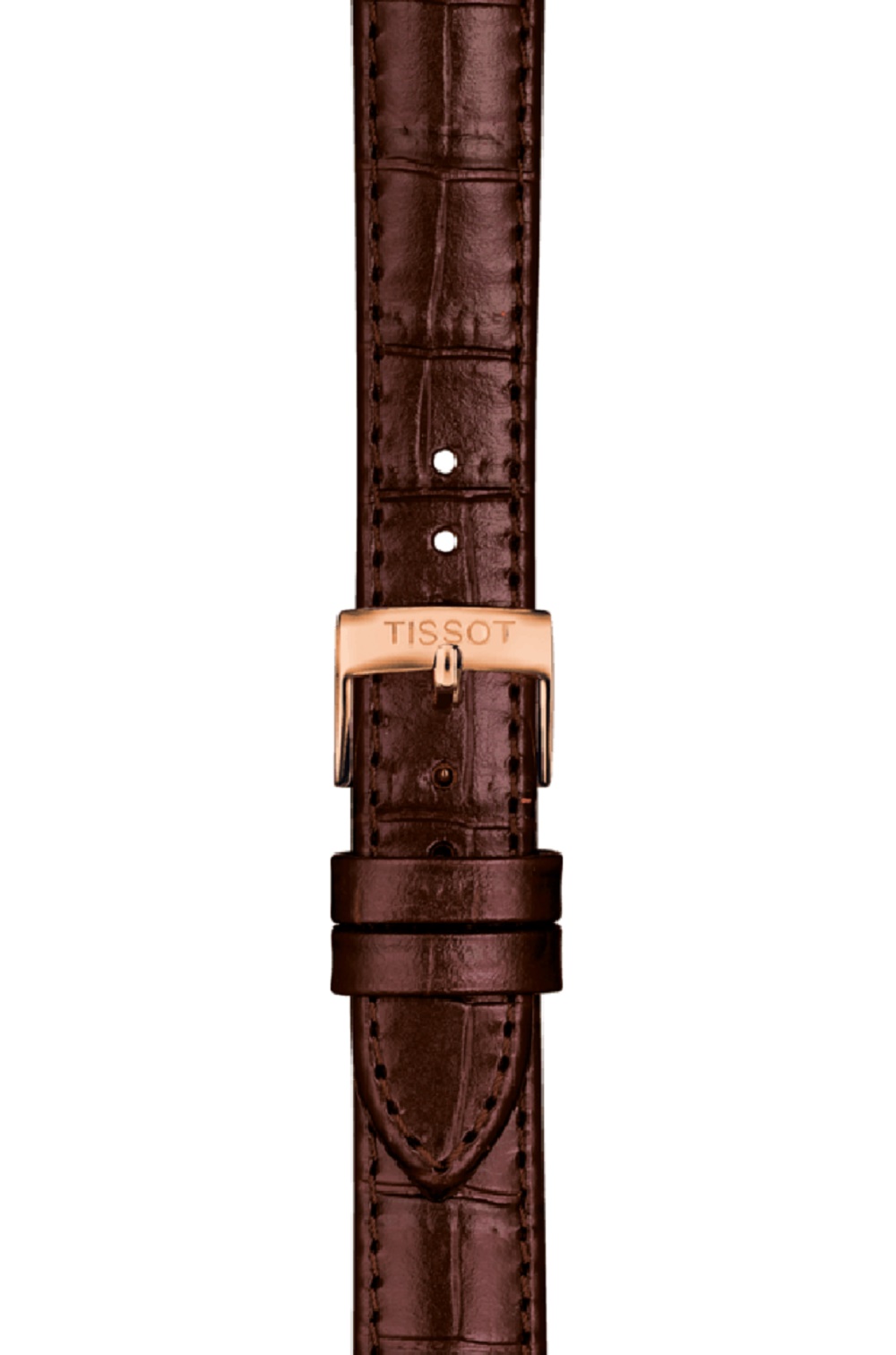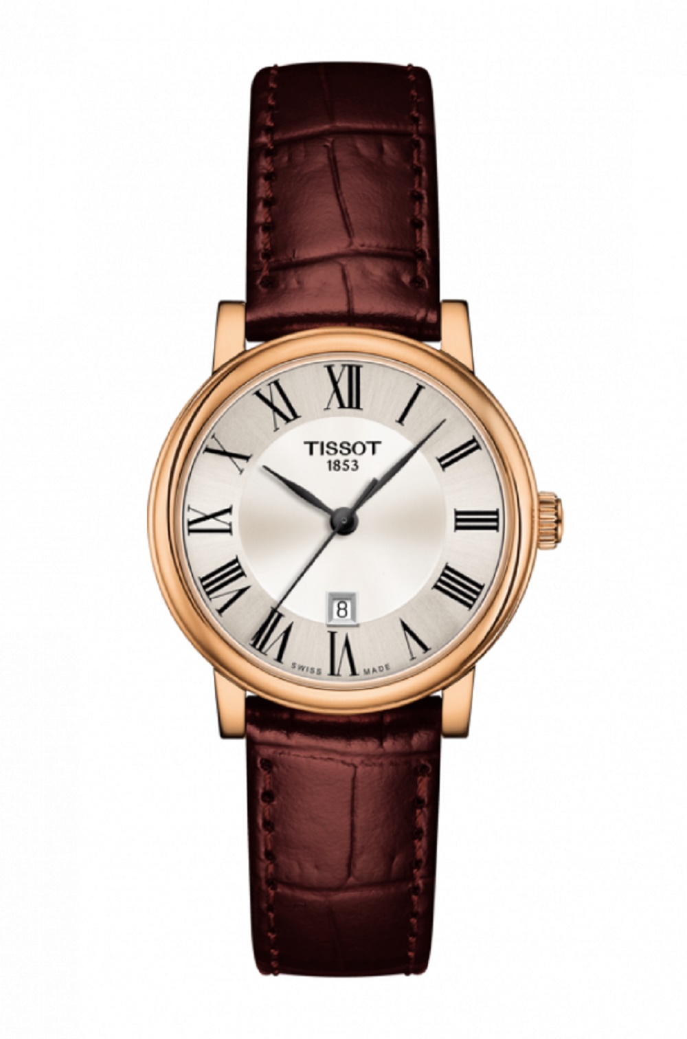 Stainless steel with rose gold PVD coating Tissot Carson Premium Lady watch with a silver roman numeral dial on a brown leather strap