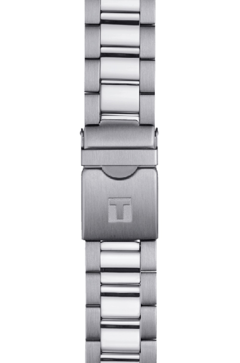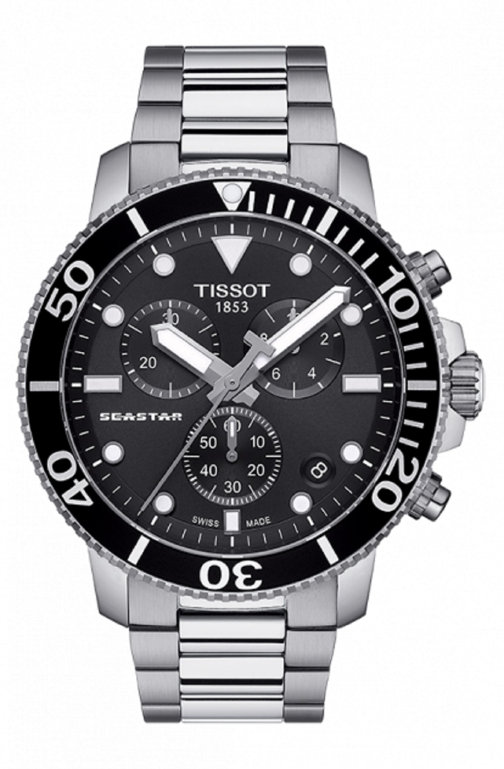 Stainless steel Tissot Seastar 1000 Chronograph mens watch with a black dial on a steel bracelet.