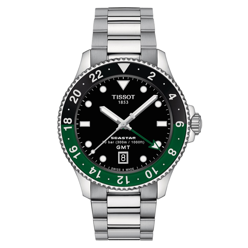 Combining all the elements you would expect in a sports watch, this model is a timepiece you can rely on – on, in or under the water. Impressive water-resistance up to a pressure of 30 bar (300m/1000 ft) is combined with the energy of a Swiss Made quartz movement. With a screw-down crown and case back and Superluminova ® ensuring it is readable in the dark, the Seastar 1000 Quartz GMT is an aquatic ace that truly has it all. The screw-down crown also offers additional protection against knocks. Discover this new diver’s watch, featuring a stainless steel bracelet, a bi-colour black and green bezel, a deep black dial and contrasting white hands and indexes.
